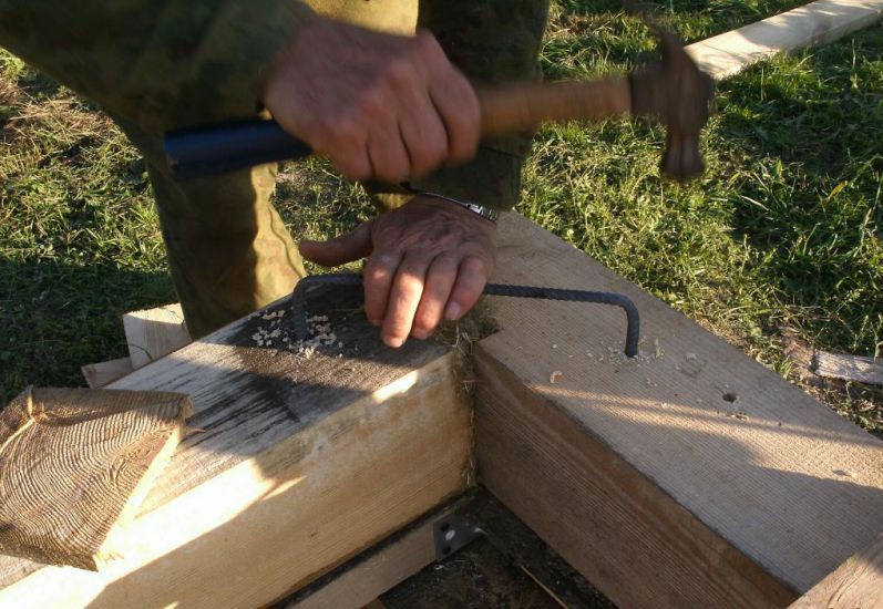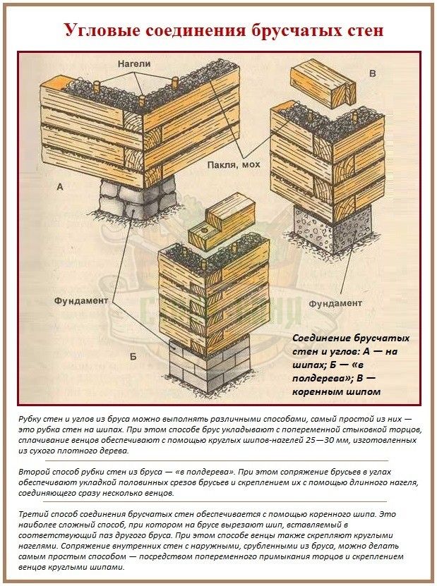 Предварительно в местах соединений смежных элементов выполняются отверстия под нагели, а от продольного смещения посредине толщины детали выполняется прямоугольный узкий паз, в который устанавливается плоский деревянный штифт. Затем в месте соединения укладывается уплотнитель, и брусья можно соединять, укладывая в отверстия предварительно установленных нагелей. Таким же образом необходимо укладывать и последующие венцы. Подобным способом можно класть брус на баню, имеющую фундамент.