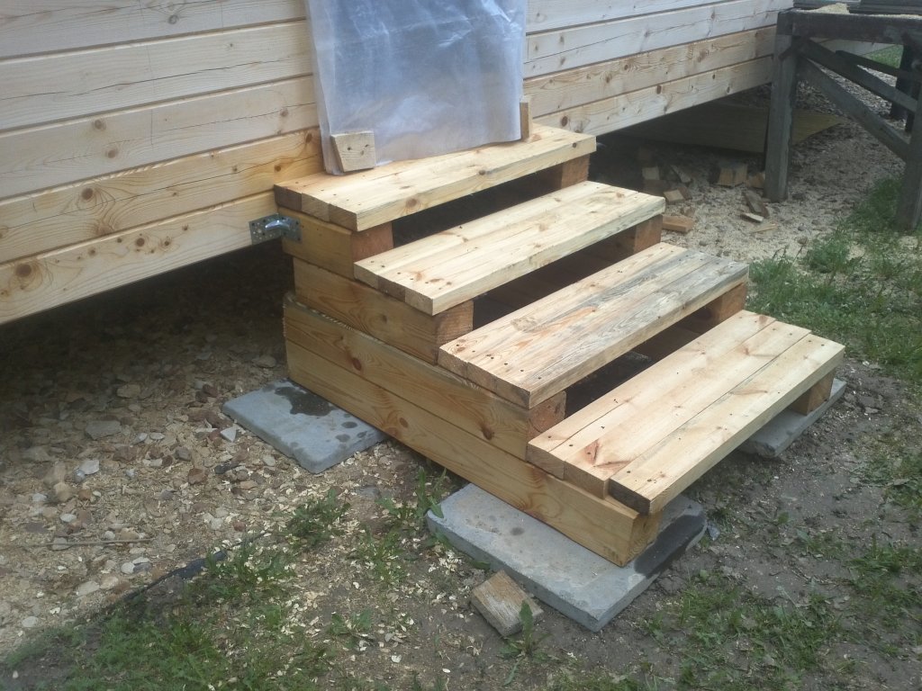 Существует несколько способов монтажа ступеней. На фото представлен один из самых простых способов — крепление на деревянной основе. Чаще всего в качестве основания для деревянных ступеней используют деревянную тетиву — поставленную на ребро толстую доку или брус. Тетивы идут параллельно друг другу, одним краем упираясь в фундаментное основание, а другим — к дому, либо в площадку крыльца.